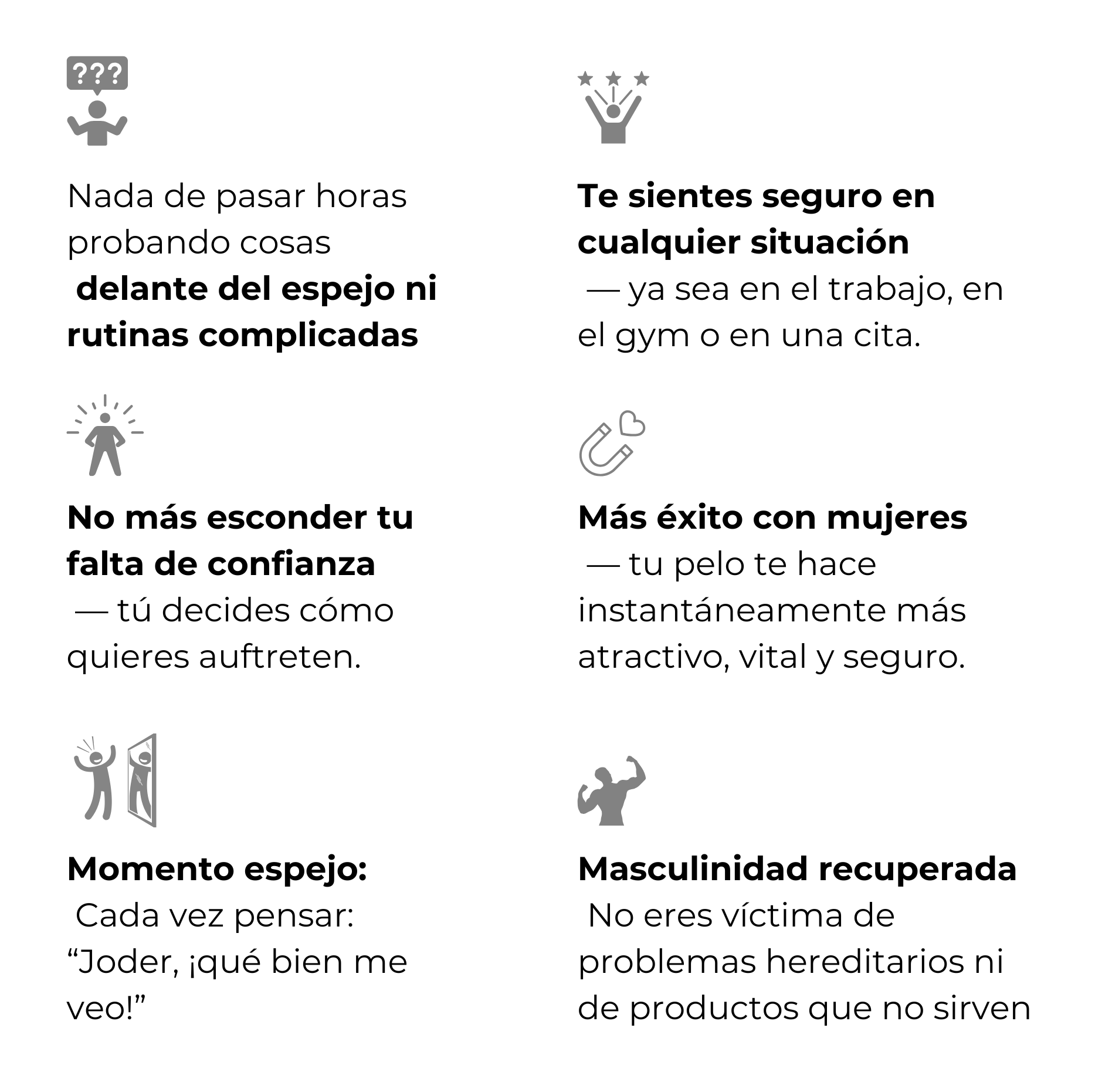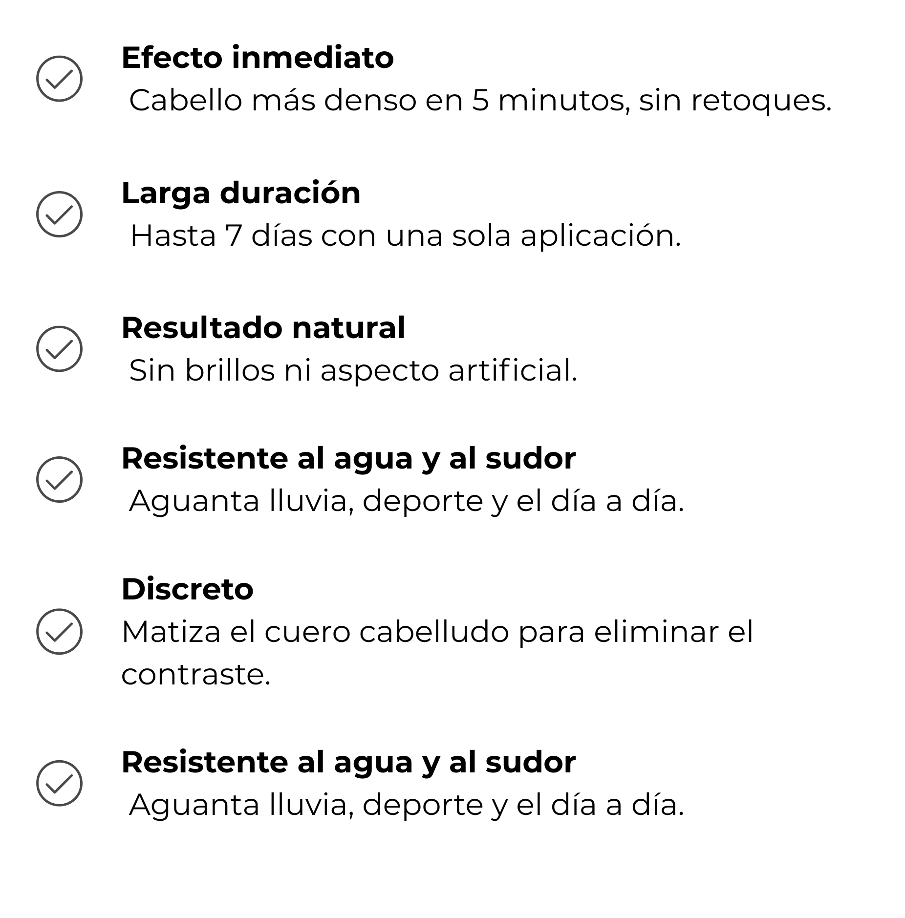 Cubre la caída del pelo hasta por 7 días seguidos. Natural y totalmente invisible